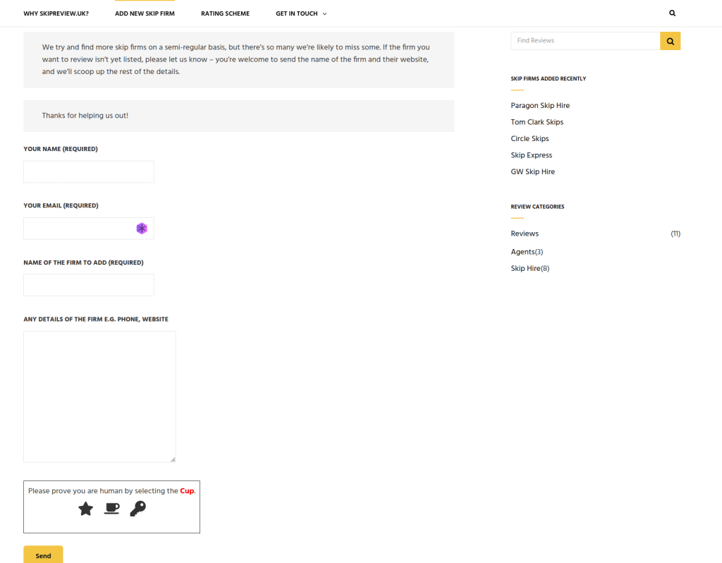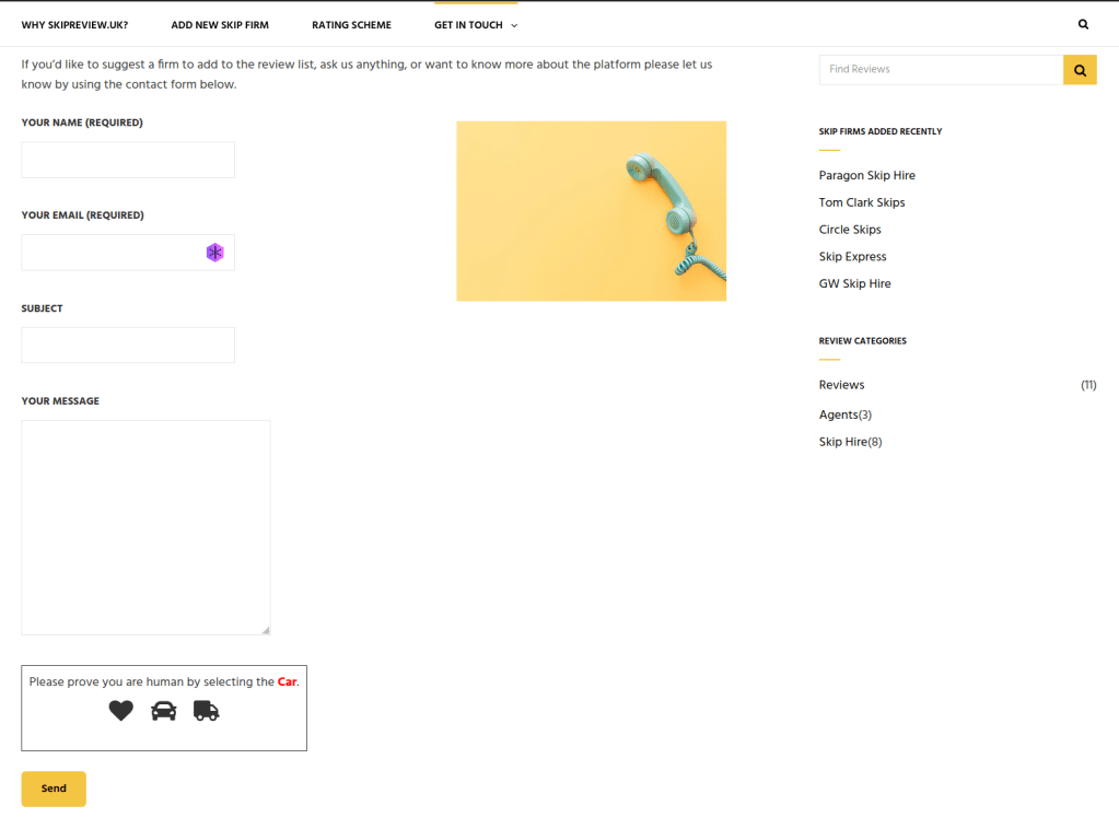 Add a simple contact form, a simple “request new skip firm” and a mechanism to add new reviews. Make the captcha workable but not complex using WordPress plugins rather than hCaptcha.